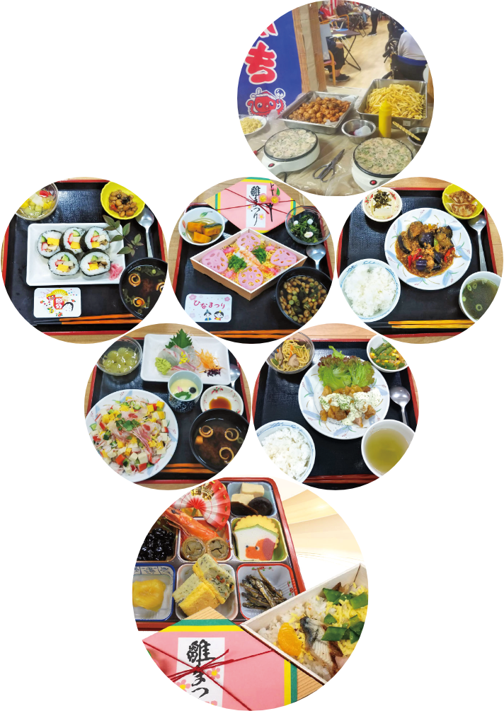 毎日のお食事は、季節ごとの旬のものをとりいれた献立にこだわりました。器や盛り付けなど見た目にもこだわった料理をホーム内の厨房で調理し、できたてをお召しあがりいただけます。普段のお食事とは違った雰囲気でお楽しみいただける「イベント食」の開催も企画し、皆様にお食事をより一層楽しんでいただく工夫もしてまいります。